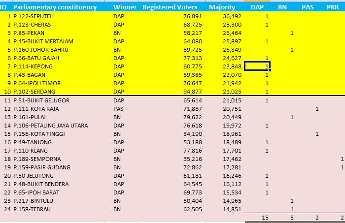 Inspired by Mr. Ng's call, I did some number crunching over the weekend. And I found a near prefect "75% - 25%" rule at work. Total number of registered voters for GE2008 was 10,923,140 (that would include people above 100 years old voters as well as phantom voters as well) and the total number of parliamentary seats is 222. In order to truly reflect 1 voice 1 vote a parliamentary constituency should be made up to 49,199 (ie. 10,923,140 divided by 222) or round up to 50,000 voters per seat. As the 75% - 25% rule is at work, you will note that # 75% of the parliamentary constituencies have registered voters below 50,000 # 25% of the parliamentary constituencies have registered voters above 50,000 Of the 75% constituencies with less than 50,000 registered voters – 75% of the seats are won by BN (remaining 25% go to PR) Of the 75% constituencies with more than 50,000 voters – 75% of the seats are won by PR (remaining 25% go to BN) If you look at the top 24 seats, you will find 79% of the seats are won by PR with majority many times over total registered voters of Putrajaya (a mere 6,608 with 5,416 turned out to vote – just fill up stadium hoki Tun Razak whose capacity is 5,000) So what if I play with the number of voters in Selangor in an imaginary re-delineation exercise? Working with 50,000 voters per constituency, with a 15% tolerance factor as proposed by Bersih: · The 15% tolerance range dictate that an average constituency size should consist of between 42,500 to 57,500 number of registered voters · For example, if you look at Kelana Jaya, PJ Utara dan Selatan, Subang and Shah Alam, total number of registered voters there is 389,206 – given 9 seats, the average number of voters per seat should be 43,243 within the range of the above range, instead of the present 5 seats only. · The above would be similar to size of certain BN seats such as Tawau (42,560 registered voters), Kota Belud (43,071), Kuala Pilah (42,328), Alor Gajah( 54,097) and Jempol (53,478). · Number of seats in Selangor should be increased from the present 22 seats (5 seats to BN and 17 seats to PR) to 32. Base on present seats ratio as well as voting trend BN would have circa 20% of the seats; the revised parliamentary seats should be 7 to BN and 25 to PR. * before certain people jump on me, yes it is purely a numerical exercise but in reality there are a lot of other factors to determine boundaries but not withstanding that, the general picture should look like above and not like now! Read more at: http://wangsamajuformalaysia.blogspot.com/2011/12/imaginary-address-to-malapportionment.html |